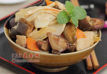 16、炒收汤汁收浓时,加入用生抽、泡香菇水、盐、生粉兑成的芡汁,炒至收汁即可。