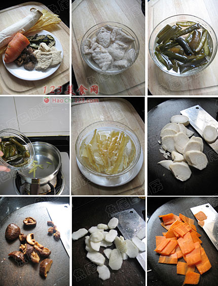 2、浸泡香菇的水可以不用倒掉,鱼是先泡一会,香菇有点软时,把水倒掉,然后再加入清水进行第二次浸泡,这次浸泡的水可以不倒掉,留着用来勾芡汁,这样炒出的素杂锦,味道更香浓。