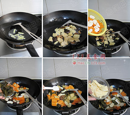 12、煎炒到花生蛋白片呈金黄色时加入红萝卜、荸荠、杏鲍菇片。