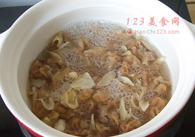 3、砂锅内添加浸泡后的银耳和适量水,加热煮沸,转小火继续炖煮。