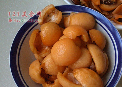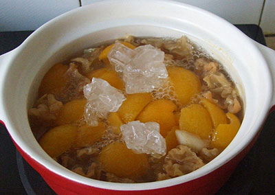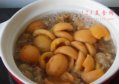 6、待金耳煮出胶质后,添加枇杷果肉进去,一同炖煮。