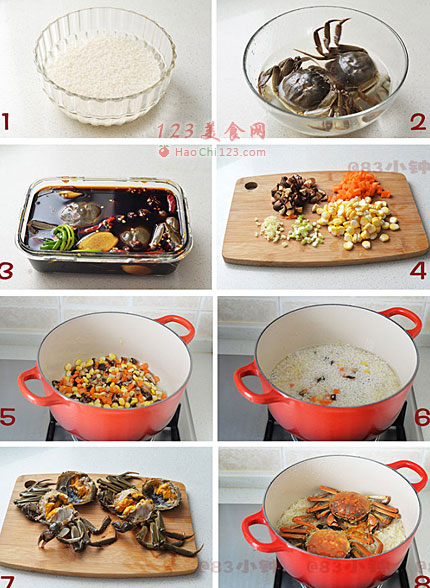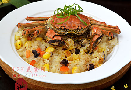 2、螃蟹挑选母蟹,切开摆在糯米表面,蒸的时侯会有金色的蟹黄流到糯米上,吃之前拌匀,很是美味。