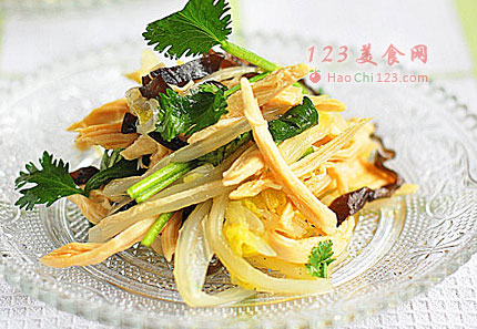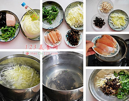 二、做法:1、白菜、木耳焯水后沥干连同香菜段和鸡丝放入容器中。
