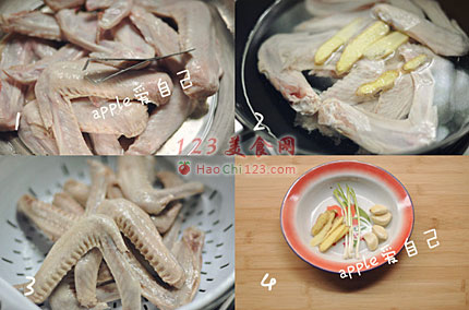 2、清水,放几片老姜片,把整理好的鸭翅丢进去,焯水,烧开就行,不用多煮。