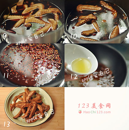 11、12、少许花生油加适量红油辣油,放辣椒碎熬下,再加入花椒油,沥干的卤鸭翅,放适量熬好的麻辣油,大火翻炒,喜欢再重口味一点的,口味再丰富些的,可以再加些孜然粉啥的一起翻炒,炒均匀了就行了。然后等彻底冷却,就可以开啃啦!