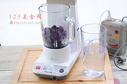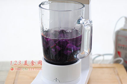 2、蒸熟的紫薯切成小丁,和熟的紫米饭一起放入真空料理机内。