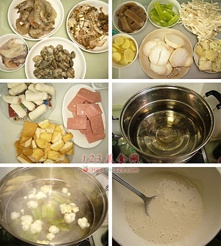 2、锅内烧开水,蔬菜豆制品类,花蛤和比管,放入沸水中焯熟,注意火候,口感清脆的材料比如青笋稍微煮就行,不要煮软了。花蛤开口即可,比管变色即可,不要煮老了,处理好的材料要沥干水分备用,不然做出的麻辣香锅会太水。