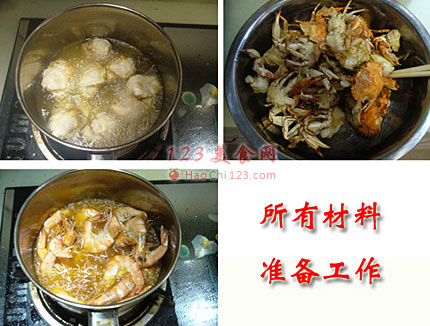 6、面粉2大汤勺,淀粉1大汤勺用水调成面糊,蟹壳内涂上面糊入油锅炸成金黄色捞出,蟹切口处沾面糊入油锅炸成金黄色捞出。