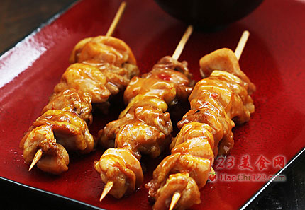 8、鸡肉串烤好后,趁热刷上泰式甜辣酱即可。