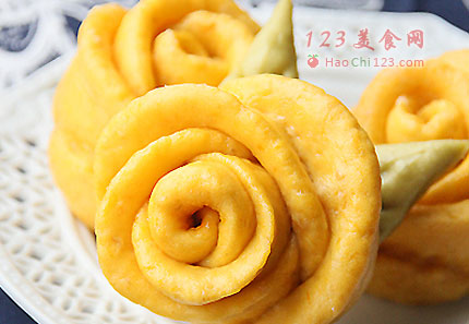 15、取其中一个竖起,整理面皮边缘,一朵玫瑰花即成,依次制作其他。