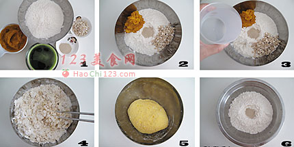 2、将燕麦、酵母放入面粉中,取适量南瓜泥放入。