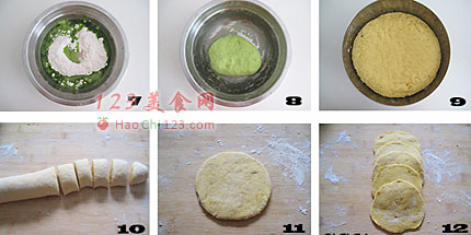 11、取其中一份揉匀擀制成比饺子皮略大略厚的片状。