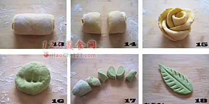 16、叶片的制作:取发酵好的菠菜汁面团,撒少许干粉揉匀。