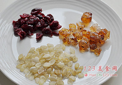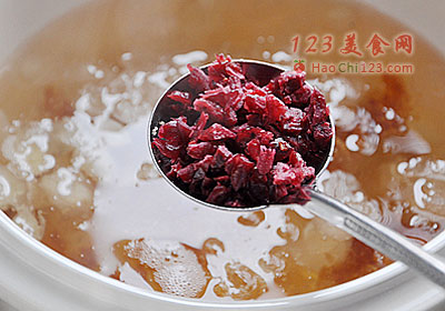 6、待皂角米煮得软糯、桃胶呈果冻状,说明甜汤煮好了,再加入切碎的蔓越莓果干,搅匀即可。蔓越莓干要在出锅前再放,这样和甜汤吃起来时酸甜度刚刚好,如果下早了煮的时间长了就会发酸,影响口感。