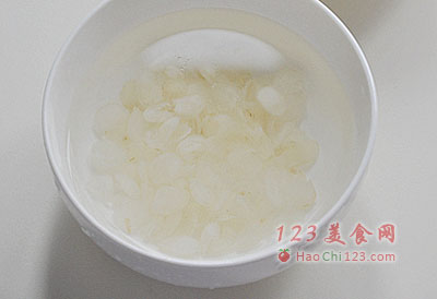2、将皂角米、桃胶分别加水泡发一夜。分开泡发是为了方便洗。皂角米没有什么杂质,泡发好后略冲一下就行,但桃胶里面的杂质比较多,待桃胶完全泡发开、变软之后,要仔细清洗掉杂质。