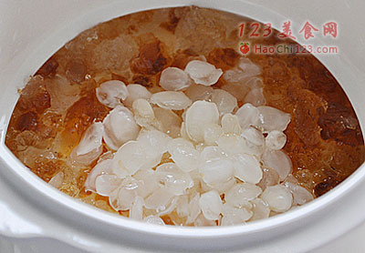 3、将泡发好、清洗干净的皂角米和桃胶放入炖锅中。