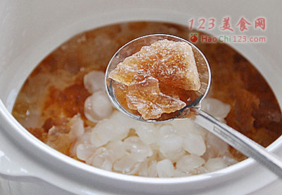 4、加入适量黄冰糖。炖这种甜汤,夏天我喜欢加黄冰糖,冬天就加红糖。