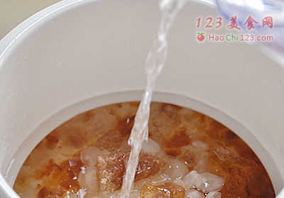 5、加入适量水。我用隔水炖盅煮的,煮60分钟,煮完锅里的水量基本不会变化,所以我一般加水加到没过所有食材后、再多加2碗水,这样炖煮出来的浓度是我喜欢的。水多了味道就淡了。如果是用明火煮,煮开后转小火继续炖煮30-40分钟,待桃胶煮得呈果冻状、皂角米煮得软软糯糯的就好了。用明火煮,在煮的过程中会蒸发掉一部分水,所以水要多加一点。