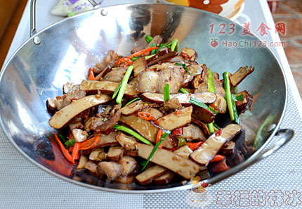 4、下入五化肉煸炒出油。