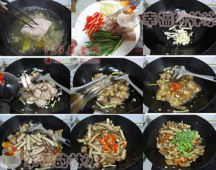 2、五花肉切片,其他配料切好备用。