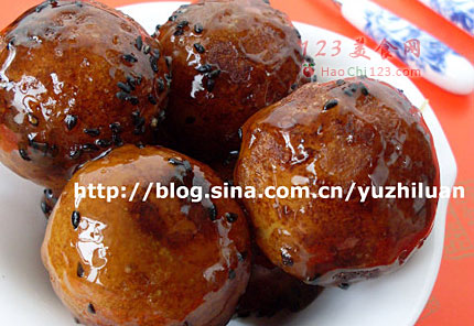 3、锅内留少许底油,放入三大勺白糖,滴上几滴白醋,在加上少许水(如果放三勺白糖的话加上一勺的水也就足够了),小火慢慢的熬,熬至水分蒸发,糖汁变粘稠,由一开始的大气泡转变成小气泡,糖汁的颜色变成浅黄色的时候(在这期间要用铲子不停的搅拌,防止糖汁沾锅),快速的倒入炸好的元宵,用铲子翻炒几下,让元宵裹匀糖汁(动作一定要快哦)。