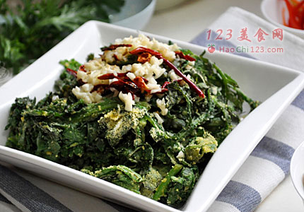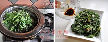 5、茼蒿蒸制6分钟左右至熟软,盛出入盘。