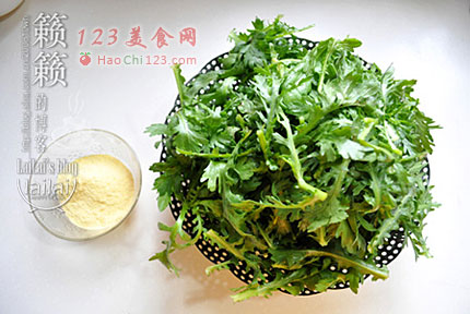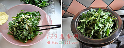 2、将茼蒿与玉米面挑拌均匀后放入蒸锅蒸格内。