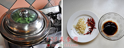 8、烧热一勺油浇淋在蒜碎干椒丝上,上桌拌匀食用。