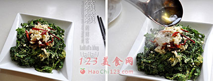 6、将小碗中调好的酱汁浇淋在蒸好的茼蒿上。