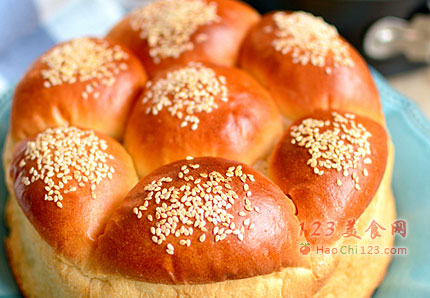 10、烤箱提前预热180℃,将发酵至2倍大左右的面包表面薄薄刷一层蛋液,沾上适量芝麻。
