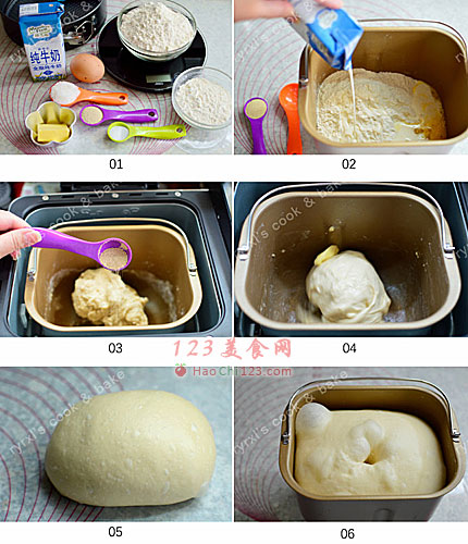 2、在面包桶中加入高低筋面粉、糖、盐、牛奶、3/4个鸡蛋的蛋液(留出1/4蛋液刷面用),启动和面程序15分钟。