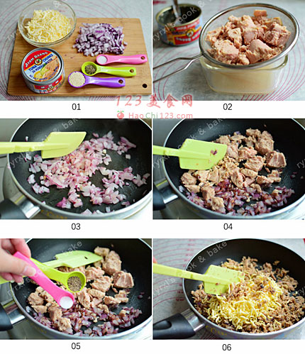 2、金枪鱼罐头选用或油浸或水浸的都可以,但一定要先将鱼肉放在筛网上,用勺子轻压,以挤出多余的油或水分,控干备用。
