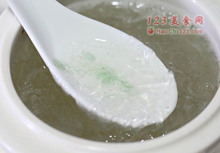 2、将适量的燕窝加100g热水,加入15g冰糖,如果冰糖不溶,用开水隔碗泡溶,冰糖全溶后,静置至40℃左右。