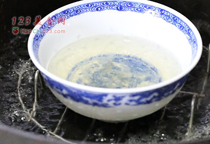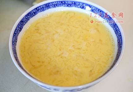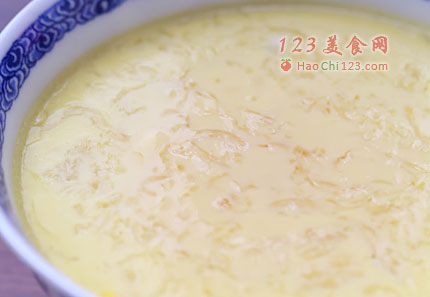 3、将4只观音山贡蛋打匀,加入冰糖燕窝水,搅匀后撇干净上面的泡泡。