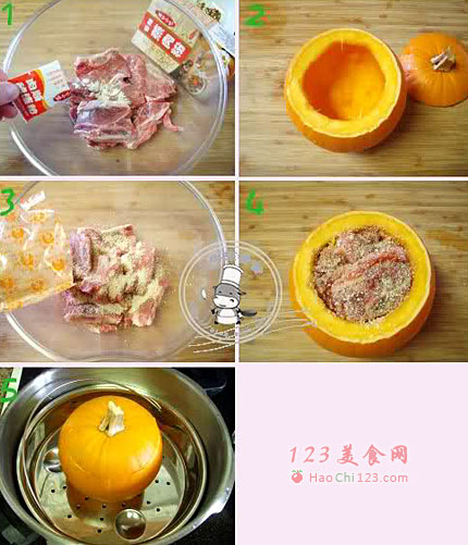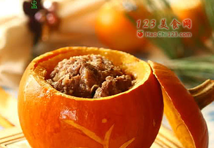 4、将拌匀的牛仔骨装入南瓜盅内。