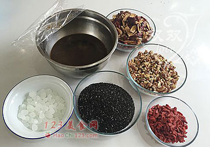 4、阿胶膏的制作,辅料对口感的影响很大,所以一定要选择好点的辅料,核桃仁、大枣、黑芝麻的用量可以根据个人喜好增减。我放的都挺多了算是,你也可以减少。