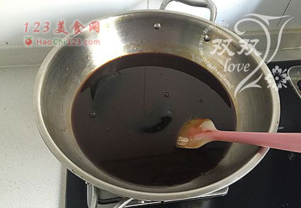 4、小火慢熬,直到熬到粘稠,提起铲子,阿胶浆会特别粘稠,不容易滴落,出现倒三角的拉丝,好像这个叫挂旗,像倒着的小旗子吗(这一步是比较关键的一个步骤,一定要保持小火慢熬,有一个经常做阿胶的告诉我,这步大约要1小时的时间,能拉出细细的丝,效果才好)。