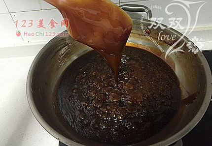 6、熬好后,关火,放入烤熟的黑芝麻(黑芝麻提前用烤箱烤香,预热170度,8-10分钟,注意观察,这个跟容易糊)。