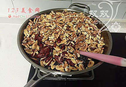 7、放入烤箱的核桃仁和大枣(核桃仁可以先捏碎点,也可以省略)。