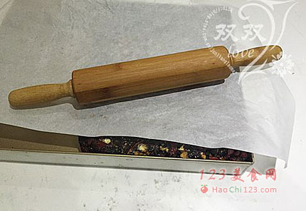 10、将其倒在不沾烤盘内(如果没有不沾烤盘,可以放在方形容器内,里面铺保鲜膜或者油纸油布,不过你要先确定油纸不沾,不然撕不下来)。