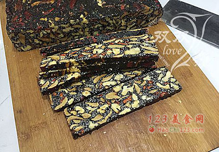 13、自然晾凉或者放冰箱冷冻3-5小时,定型,用硅胶刮板将定型的阿胶膏取下(如果你用的是不沾烤盘,那你尽量选择软性的刮板,不然会将不沾烤盘涂层刮伤哦)。