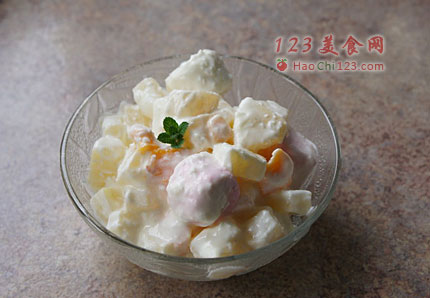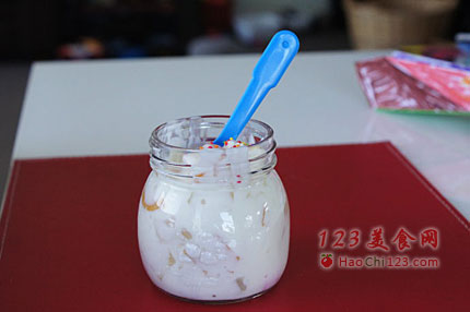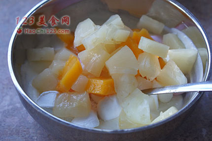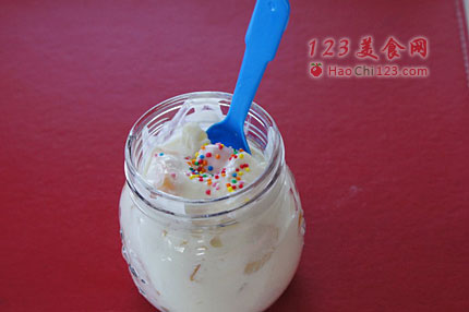 5、如果觉得不够甜,可以适当加些细砂糖。我用了水果罐头,水果本身就是在糖浆里保存的,所以够甜了。