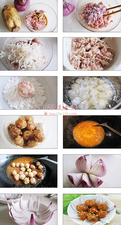 12、把滚了酱汁的莲藕丸子摆入“莲花座”中,如莲花盛开时。