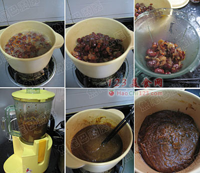 13、把搅拌好的红枣桂圆糊倒入锅中,中小火慢慢煮,一边煮一边搅拌,以防黏锅。