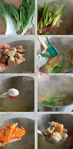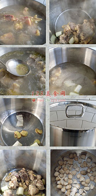 8、将锅中的汤煲一个小时以后,加入蘑菇继续煲十分钟,然后加入两小勺盐。