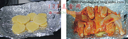 2、腿骨和翅尖处很容易烤黑,可以提前用锡纸包住此处(我忘了包了)。