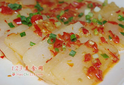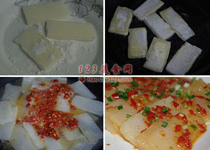 4、锅热油,放下淮山片用小火两面煎黄,然后放入剁辣椒、盐和高汤,稍微翻炒一下。