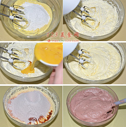 5、红曲粉,低筋面粉,泡打粉混合均匀过筛二次后,加入黄油糊中,同时加入香草精。