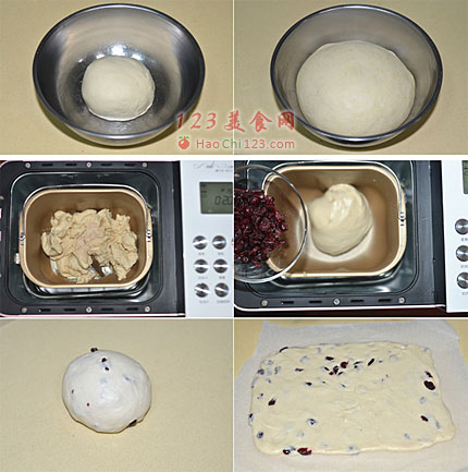 14、一直揉到完全阶段后加入蔓越莓干,搅拌几下让蔓越莓干分布均匀即可。