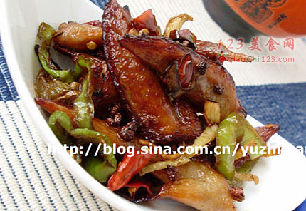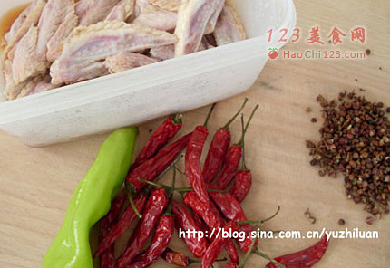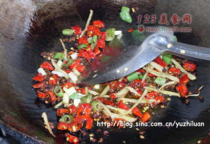 3、锅内留底油,放入花椒粒炸出香味,然后放葱段姜丝翻炒,最后放入辣椒段翻炒几下。